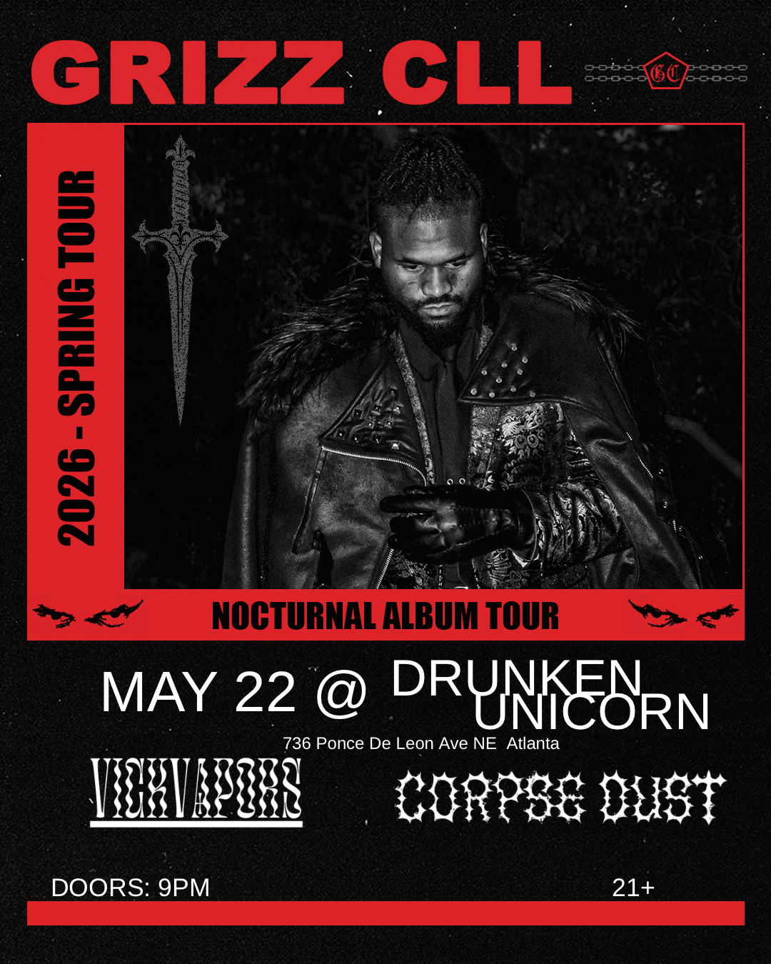 Grizz CLL, Vick Vapors, Corpse Dust, Astrid Aesthetic Friday, May 22, 2026 9:00 PM 11:59 PM Google Calendar ICS Friday, May 22 @ The Drunken UnicornClub De Vampiros presents...Grizz CLL, Vick Vapors, Corpse Dust, Astrid Aesthetic9pm / $18 - $25 / 21+ GET TICKETS GET TICKETS