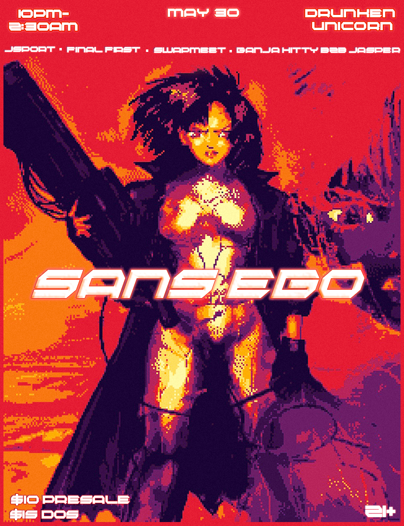 Back to All Events Sans Ego: JSport, Final First, Swapmeet, Ganja Kitty B2B Jasper Saturday, May 30, 2026 10:00 PM 11:59 PM Google Calendar ICS Saturday May 30 @ The Drunken UnicornSans Ego:JSport, Final First, Swapmeet, Ganja Kitty B2B Jasper10pm / $10 - $15 / 21+